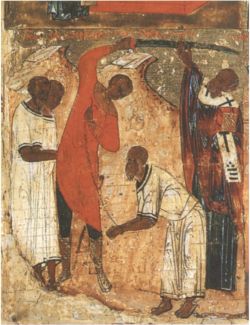 Для икон данной группы особое значение имеет образ инока. В первой же сцене юного Николая для обучения приводят к пожилому монаху, сидящему на престоле и благословляющему пришедших1481. Здание, на фоне которого изображён настоятель, можно рассматривать как образ монастыря, с крышей, подобной балдахину (Виченца) или своду (Луды, Вологда, на иконе из Кирилло-Белозерского монастыря перекрытие здания прямоугольное). В сцене Погребения среди народа обязательно встречается фигура одного инока, в темной рясе и черном клобуке (Луды, КБИАХМЗ), а иногда и большее число – двое монахов (Виченца), стоящий впереди – с бородой и рядом с ним молодой, безбородый. Наибольшее количество монашеских фигур присутствует на иконе из Вологды: впереди, также как на иконе из Виченцы, двое монахов разного возраста, ещё несколько голов в черных клобуках позади них. Подобное изобилие монахов на погребении святителя Николая позволяет трактовать сцену как иллюстрацию из монастырской жизни. Монастырская тематика характерна для текста Иного жития1482, другого святителя Николая, жившего в годы царствования императора Юстиниана в VI в. Он был архимандритом Сионского монастыря в Ликии и впоследствии епископом Пинарским. Различные эпизоды из жизни святого Николая Сионита были привнесены в начале X в. в тексты жития святителя Николая Мирликийского, жившего в III–IV вв. Тексты, повествующих о чудесах святого Николая Сионита в монастыре, стали чрезвычайно популярны в житийных циклах русских икон XVI в. Текст Иного жития, вероятно, послужил основой при создании композиции «Служба Николы». Она занимает очень важное место в житийном цикле – располагается рядом с образом в среднике1483.