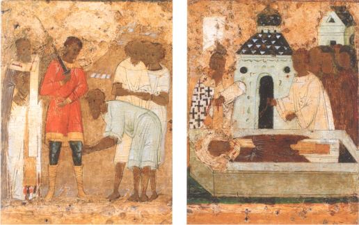 Морские композиции очень близки к иконографии «Сошествия во ад» изображением моря. Это замкнутые водоёмы, окружённые острыми уступами, скалистой, неприветливой к человеку, враждебной ему земли. Белые очертания волн на фоне иссиня-черной воды создают эффект кипящей, взыгравшей глубины, неуёмной стихии, неутихающего шторма. Природные формы вторят происходящему. В сцене казни двое осужденных стоят на заднем плане, обратясь к происходящему. Очертаниям их фигур вторят силуэты двух горок. Сцена представлена в пейзаже, хотя иногда горки сочетаются со стеной и сооружением с двускатной кровлей (КБИАХМЗ), которые призваны обозначить близость города. Это напоминает композицию «Распятия Господня», когда сочетаются изображения горок и стены, символизирующей близость Иерусалима. Также соединение стены, зданий и горок может свидетельствовать о заботе мастера не ослаблять торжественного характера всех житийных композиций, насытить пространство клейма всем «арсеналом» необходимых иконных форм.