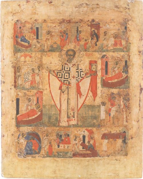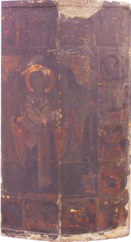 6. Святитель Николай Чудотворец Можайский, с житием. Икона третьей четверти XVI в. из Старицы. Верхнее Поволжье. Фотография до расчистки и разделения на отдельные композиции