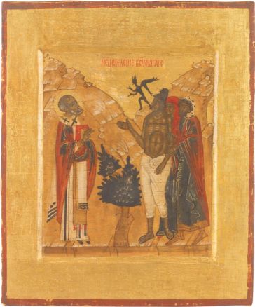 4. Святитель Николай Чудотворец исцеляет бесноватого. Икона-врезок. Третья четверть XVI в. Верхнее Поволжье. Первоначально – клеймо житийной иконы святого Николая Можайского из Старицы