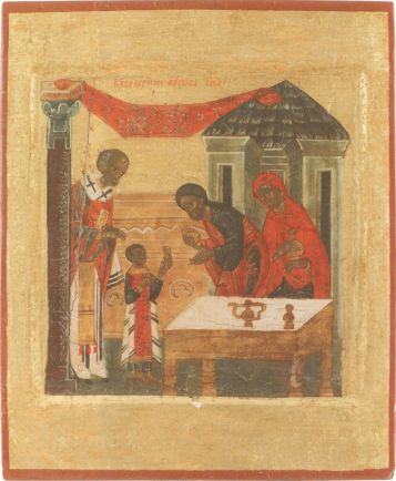 Наряду с произведениями «зарайского» и можайского типов, традиционных для русского искусства позднего Средневековья, в собрании М. Де Буара хранится небольшая икона Николая Чудотворца конца XVII – начала XVIII в. (ил. 15), принадлежащая к изводу, крайне редкому для русской иконографии святителя1620 Это изображение епископа на престоле, почти не имеющее прямых аналогий ни в искусстве XVII столетия, ни в более раннее время.