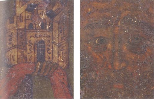 В 2008 г. в коллекцию М. Де Буара разными путями поступили две небольшие иконы (врезки в старые доски), изображающие чудеса Мирликийского архиепископа Николая: исцеление бесноватого (ил. 4) и возвращение из плена Агрикова сына Василия (ил. 5). Размеры, художественные особенности и приёмы поновления показывали, что это фрагменты одной и той же житийной иконы, распиленной не старообрядцами-старинщиками, а нашими современниками1565. Вскоре выяснилось, что ещё несколько лет назад эти сцены были частями большого местного образа Николы Можайского, с житием, утратившего лишь одну (левую) из трёх составлявших его досок (ил. 6, 7)1566. В 2004 г. памятник в нерасчищенном виде (со сплошь переписанными фонами средника и клейм, частичными прописями, под слоем потемневшей олифы), но с явными признаками живописи эпохи Ивана Грозного, поступил в Аукционный дом «Гелос» (Москва). Судьба произведения после продажи – яркий пример варварства современных торговцев иконами, унаследовавших худшие традиции дореволюционной антикварной практики: образ с почти полностью сохранившимся средником был распилен на отдельные композиции, затем распроданные. Два публикуемых клейма, уже в виде икон-врезков, воссоединились в собрании М. Де Буара, но ещё десяток фрагментов распиленного произведения находится в других руках (возможно, у нескольких разных владельцев).