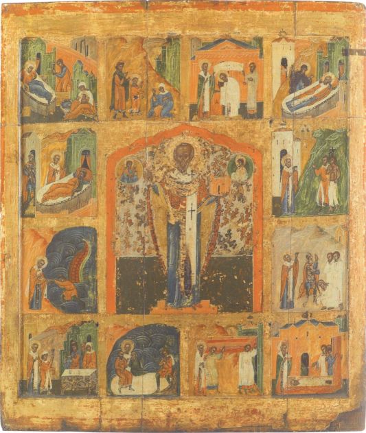 15. Святитель Николай Чудотворец на престоле, со сценами жития. Икона конца XVII – начала XVIII в. Ярославль