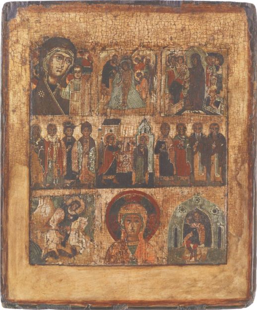 Центробежный тип композиции публикуемого памятника напоминает многочастные народные иконы, в большом количестве создававшиеся в XVIII–XIX вв. Более ранних памятников такого рода пока известно мало, но есть основания полагать, что уже в XVII в. они были популярны в качестве домашних икон. Так, в собрании М. Де Буара находится многочастная икона конца XVII – начала XVIII в.1618, состоящая из трёх регистров по три клейма в каждом (ил. 14). В верхнем ряду находятся изображения Богоматери Казанской, Богоявления (в центре) и Воскресения – Сошествия во ад. В центре среднего ряда представлено Благовещение, по сторонам которого изображены святые: пророк Илия, Николай Чудотворец, Борис и Глеб, Козьма и Дамиан, Зосима и Савватий Соловецкие. Нижний регистр включает сцену Чуда Георгия о змие, оплечный образ великомученицы Параскевы Пятницы (в центре) и изображение великомученика Никиты с бесом. В этом произведении заметна разница между центральным крестом и угловыми сценами, но в целом сохраняется ощущение равномерности построения композиции и функционального равноправия всех девяти клейм. Варианты взаимодействия крестообразного и регистрового приёмов представлены многочисленными двух- и трёхрядными иконами XVII–XIX вв., где часто изображаются те же персонажи и сцены, что и на иконе XVI столетия из собрания М. Де Буара1619.
