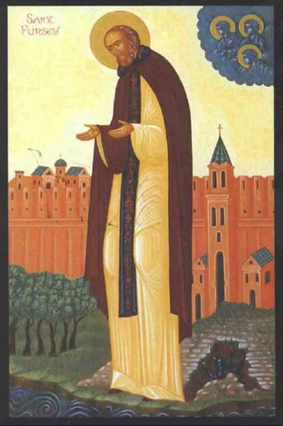 Святой Фурсей (Fursy) – один из тех живших в старые времена святых ирландцев, чьё житие известно лучше других. Его родители, Финтан (Fintan) и Жельжес (Gelges), были из княжеских родов. К счастью, одаренный разумом и душевными качествами Фурсей был отдан на воспитание под руководство священников и монахов, отчего он стал весьма умел и опытен в науках, относящихся, прежде всего, к священному писанию. И неудивительно, что он посвятил себя монашеской жизни и вскоре оказался во главе монастыря Хатмат (Hathmat), или Киллурса (Killursa), где собирались желавшие посвятить себя Богу новички со всех концов Ирландии. Он часто покидал монастырь для проповеди в других концах страны. Однажды, отправившись в королевство своего отца, он заболел и вскоре пришёл в крайне тяжёлое состояние. Во время болезни, у него были видения и экстатические состояния, которые доставили ему немало трудностей и неприятностей.
