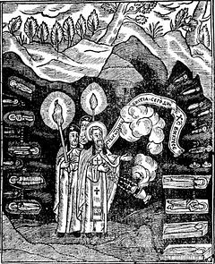 Для удостоверения святости, общей всем святым преподобным и богоносным отцам нашим: не только тем, которых святолепные жития описаны в этой книге, но и прочим, гораздо более многочисленным, которых честные мощи нетленно почивают в тайне пещер, хорошо вспомнить нам здесь такое чудотворное знамение. В год от сотворения мира 6971, от Рождества же Христова 1463, при благочестивом князе Киевском Симеоне Александровиче Олельковиче и брате его, князе Михаиле, и блаженном архимандрите Печерском Николае, занимал должность начальника пещер один из братии, священноинок Дионисий, по прозванию Щепа. Он на Великий день вошел в пещеру преподобного Антония покадить тела усопших святых и пришел на место, называемое община или трапеза. Покадив тут, он сказал: «Святые отцы и братие, сегодня великий день: Христос воскресе!». И тут вдруг понесся ото всех мощей голос, как гром: «Воистину воскресе!»