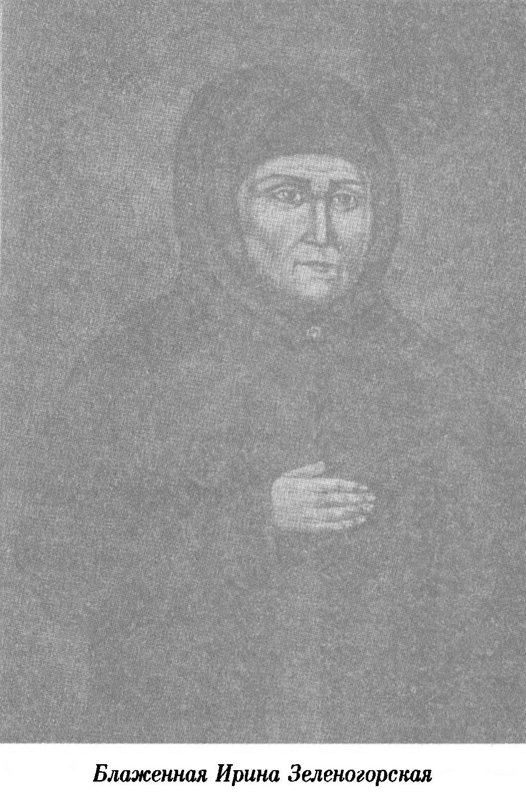 Местное предание сохраняет память о ней, как о замечательной по своей святой жизни старице. Из хранящегося в монастыре рукописного жизнеописания старицы Ирины Лазаревой известно, что она – дочь крестьянина деревни Муратовки, Сергачевского уезда Нижегородской губернии и родилась в первых годах XIX ст. На втором году от рождения она лишилась матери, которая была убита грозою в Ильин день, и поступила на попечение мачехи, женщины сварливого характера, а спустя еще некоторое время потеряла и отца. С этого времени началась для Ирины тяжелая жизнь. Мачеха сильно не взлюбила свою падчерицу и всячески старалась выразить ей свое нерасположение… Двенадцати лет от роду Ирина вступила в брак с сыном одного крестьянина своей деревни, но тотчас же после брака удалилась в лес, где и скрывалась до поступления ее мужа в рекруты. Выходя только тайно на работу в помощь любимой свекрови. Начало своих иноческих подвигов она полагала в Киеве, при мощах святых угодников, поступив в число сестер Фроловского женского монастыря. Там она трудилась девять лет, неся разного рода налагаемые на нее послушания: носила воду, караулила сады, пекла и продавала просфоры и т.д. По истечении девяти лет, Ирина перешла в Дивеевскую женскую общину, в Ардатовском уезде, находившуюся тогда под непосредственным покровительством и руководством Саровскго старца, преподобного Серафима. Своим беспрекословным повиновением и точнейшим выполнением налагаемых на нее послушаний она обратила на себя особенное внимание блаженного Старца, который называл ее единственной своею духовной дочерью…После шестилетнего пребывания в Серафимо-Дивеевской обители Ирина, по благословению отца Серафима, перешла в Зеленогорскую общину, где и подвизалась до своей кончины в особой убогой кельи. Беспрерывно находясь в труде, она глубочайшим смирением и своим неизменно веселым настроением, с каким исполняла все возлагавшиеся на нее работы, воодушевляла к трудам и прочих сестер обители, мирян же особенно увещевала быть милостивыми. Кроме келейных и общественных молитв, Ирина, неся крест юродства, целые ночи в летнее и зимнее время посвящала молитвенному подвигу, находя неизъяснимую усладу в непрестанной сокровенной молитве и располагая к ней инокинь: ее видели на молитве и в башне, и в колодце, и под церковью, ив других потаенных местах. Благочестивая старица Ирина, перенеся немало горя от неразумных на своем веку, тихо скончалась за молитвою, будучи почти ста лет от роду24.