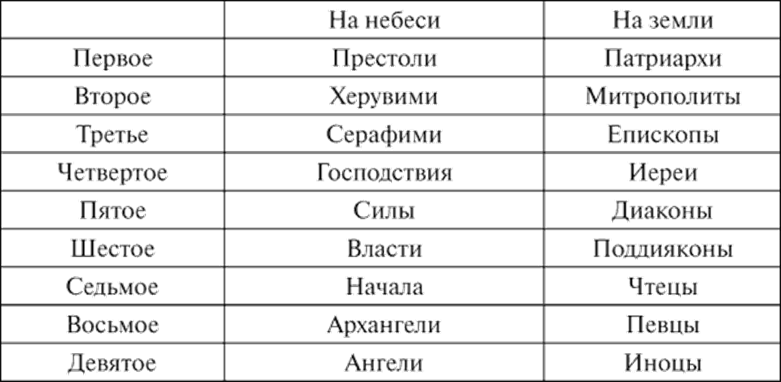 Возможно, именно классификаторский подход к человеку определил популярность иерархической системы Дионисия Ареопагита. Из века в век русские книжники переписывали следующую схему христианского неоплатоника, находя в ней неисчерпаемый источник вдохновения в идее иерархии.