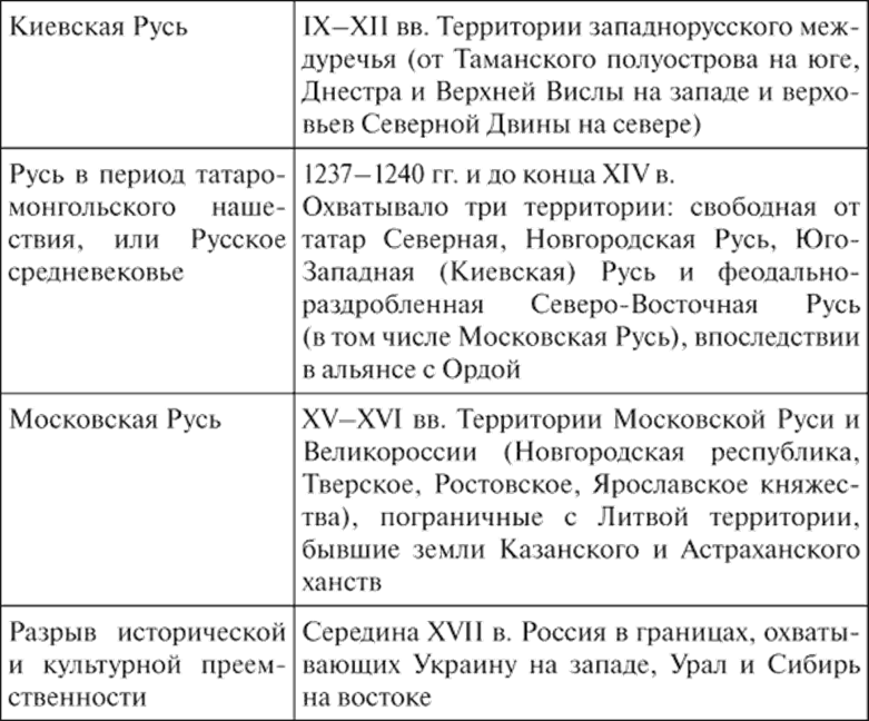 Древняя Русь, охватывая период с XI по XVII в., является сложным и многообразным явлением, имеющим разные, подчас не совпадающие по содержанию элементы, так что представления о человеке XI–XII вв. будут радикально отличаться от представлений XIV в. и последующих веков. В настоящей главе речь пойдет об общих элементах антропологического мировоззрения в древнерусский период. Вопрос об эволюции антропологических взглядов не будет рассмотрен сколько-нибудь значительно, поскольку это тема требует большого исследования. Для ориентации в границах времени и пространства рассматриваемого периода служит следующая таблица.