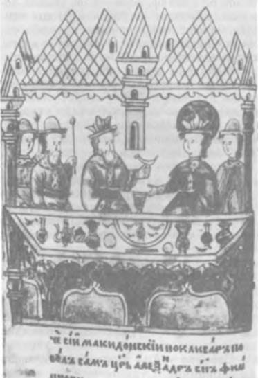 Александр Македонский, выдающий себя за посла, пирует с Дарием. Миниатюра к Сербской Александрии. XVII век.