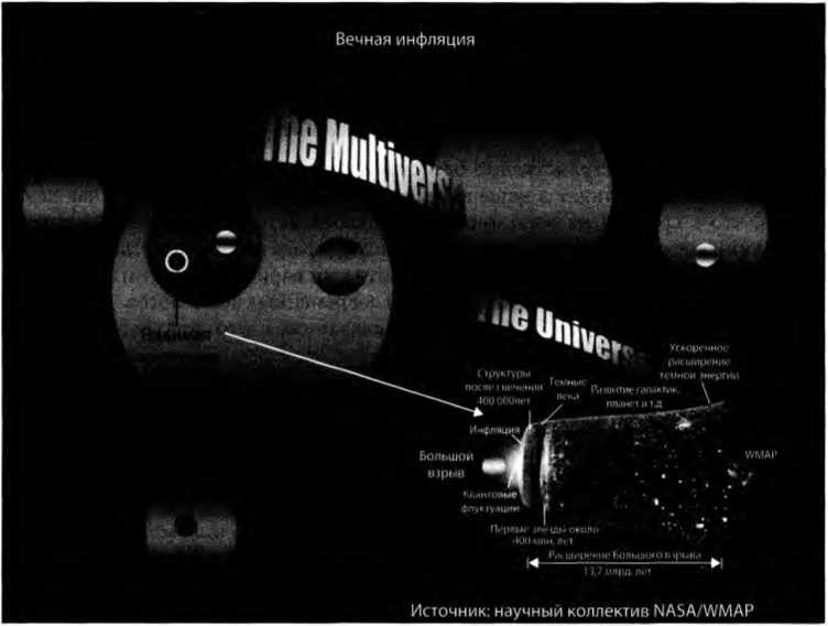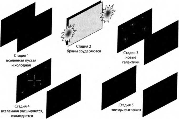 Вспомните, что в типичной инфляционной модели параметр в уравнении состояния отрицателен (для космологической постоянной давление = минус плотность). Что касается экпирозиса, сингулярность соударений имеет место в измерении «балк» между обеими бранами, а не внутри браны, на которой, вероятно, живем мы сами.