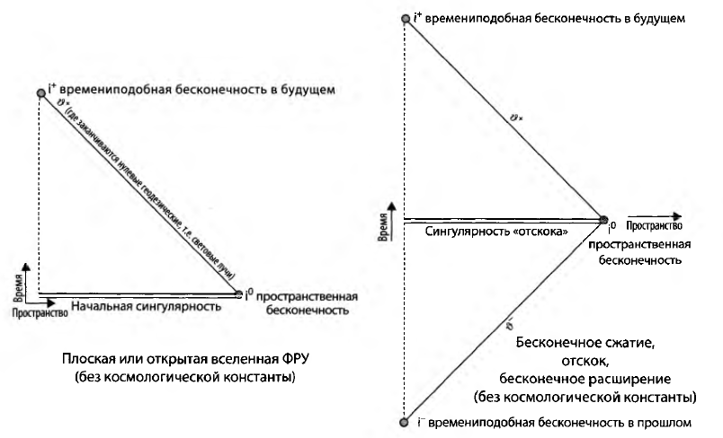 На вопросы «Являются ли с-границы [этот термин поясняют Рис. 3.8 и последующее обсуждение], как например времениподобная бесконечность прошлого и будущего и scri+, физически реальными краями пространства-времени (реальными, как черная дыра представляет собой онтологически реальную сущность) или это только математические условности? Ведь если бесконечность «актуальна» и достижима, то с-граница должна быть фактическим краем к пространству-времени, физически реальным в своей онтологии», Эллис (в личном сообщении) кратко ответил: