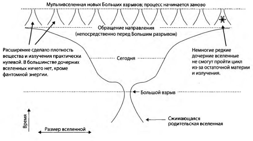 У меня проблема со ВСЕМИ циклическими космологиями.... Фаза коллапса у этих моделей всегда имеет зависящий от времени гамильтониан для флуктуаций квантового поля на классической основе. К тому же классическая основа становится сингулярной. Это значит, что теории поля будут возбуждаться до все более высоких энергетических уровней (определим энергию некоторым адиабатическим образом в течение эпохи, когда космология все еще довольно медленно меняется, и будем использовать ее для классификации состояний, даже если она не сохранилась). Высокоэнергетические состояния в теории поля имеют эргодическое свойство – они быстро термализуются в том смысле, что система проходит все свои состояния. Уилли Фишлер и я предположили, что в этой ситуации вы, вероятно, снова будете стремиться максимизировать энтропию. Мы назвали это Черным хлопком и предположили, что уравнение состояния материи будет снова стремиться к р = ρ. Кажется, глупо представлять, что, даже если за этим последовало бы повторное расширение, то кто-то начал бы это расширение с состояния низкой энтропии или что у кого-то вообще был контроль над начальным состоянием (личное сообщение, 12 октября 2007).