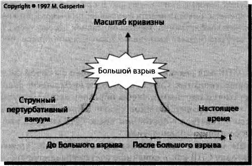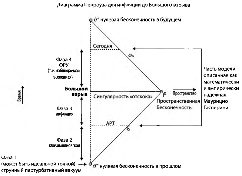 К модели «до большого взрыва» (Veneziano & Gasperini 2003) имеет отношение родственная проблема. Здесь струнный вакуум – где происходит локальный коллапс в эйнштейновской системе координат (что соответствует возбуждаемой дилатонами инфляции в струнной системе координат) до большого взрыва – является довольно простым, однородным, почти пустым и не имеет универсальной стрелы времени. Но, с математической точки зрения, начало эпохи «до большого взрыва» – или, точнее, любой эпохи «до большого взрыва», ибо модель действительно подразумевает также сценарий мультивселенной – прослеживается до максимально простого, статического состояния только в бесконечном прошлом (принцип асимптотической тривиальности в прошлом). Но это можно также интерпретировать просто как локального предшественника большого взрыва, а не как свойство, характеризующее бесконечный струнный вакуум в целом. (Vaas 2004, рр. 18–19)