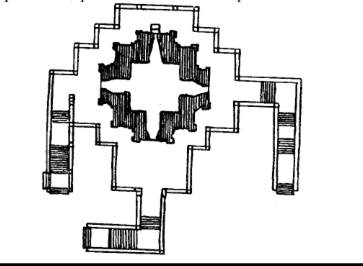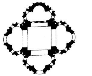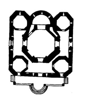 Еще позднее появляются шатровые храмы с приделами. Центральная шатровая часть обстраивается иногда со всех четырех сторон, и план креста.