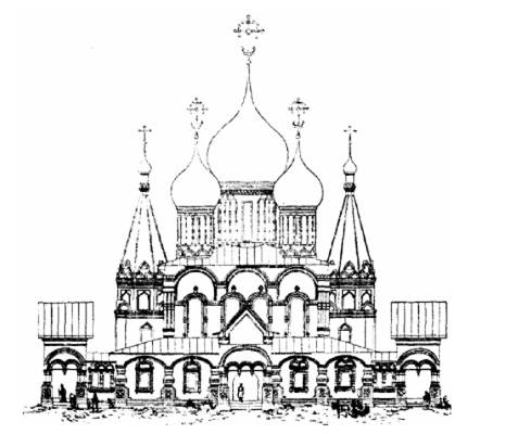 Для каменного церковного зодчества это план совершенно новый. Но русский зодчий-плотник не нашел бы в нем особой новизны: именно по такому плану он и привык срубать излюбленные шатровые храмы. Каменный храм строился в данном случае «по подобию» деревянных.