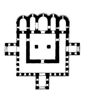 Нередко храм шатрового типа опоясывается галереей внизу или на высоте второго этажа, и его крестообразный план утрачивается, приближается к четырехграннику.