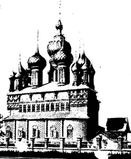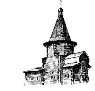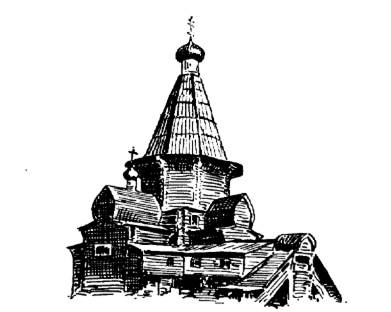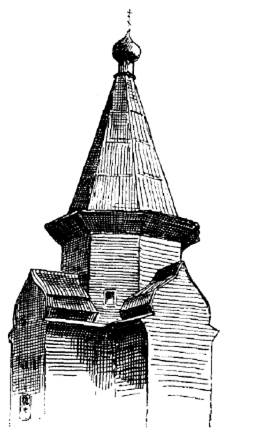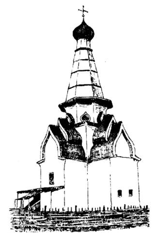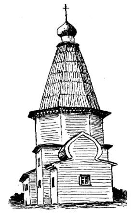 Это, если можно так выразиться, церковь-башня. Восьмигранный высокий сруб башни увенчивается высокою кровлей-шатром с одною главой вверху – таков простейшей тип шатрового деревянного храма в его главной основной части. Алтарь и трапеза помещаются в особых пристройках – «прирубах» – с востока и запада.