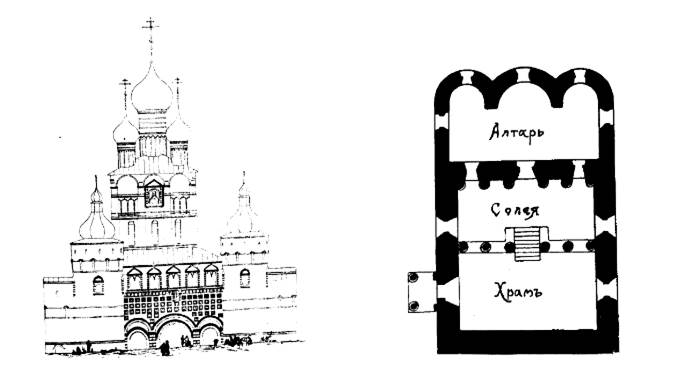 Объяснений для этой необычайной конструкции храма надо искать, всего скорее, в особом его значении, как крестовой церкви ростовского митрополита Ионы Сысоича, строителя кремлевских стен Ростова Великого с их оригинальными храмами.