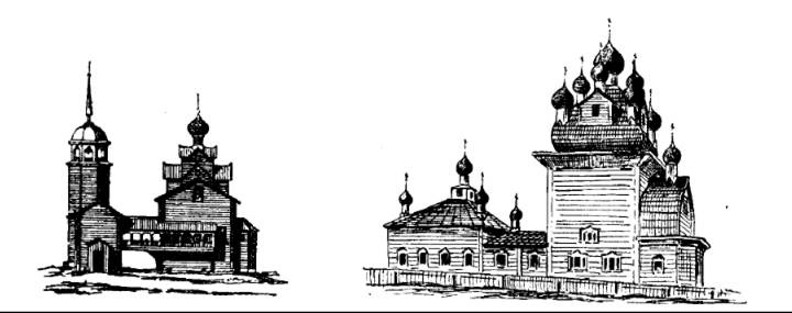 Шатровые деревянные храмы, построенные в XVI‒XVII веках, в наиболее интересных образцах воспроизведены нами (церкви в Малой Шалыге, Пучуге, монастырь Александра Куштского, церковь в Варзуге).