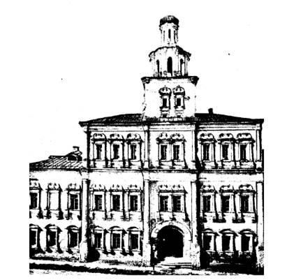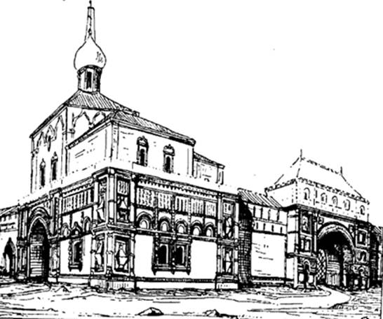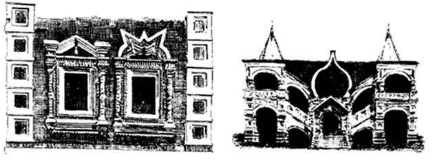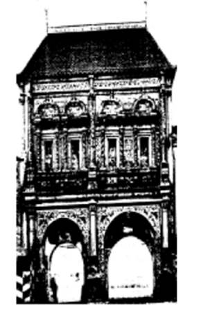 Таковы же были окна и в древнем каменном здании у московских Воскресенских ворот, на месте которого построена городская дума. Это здание было создано, вероятно, в конце XVII века и как предполагает А.А. Потапов, могло служить образцом для известной Сухаревой башни. Этот трехэтажный дом с колоннами и восьмиугольной башней на первый взгляд не похож русский. Но при более внимательном осмотре русские элементы становятся заметнее. На третьем этаже (на рисунке покрытом крышей), первоначально была терраса – «гульбище» с теремом, увенчанным характерною восьмигранною башенкой с кубовастою крышей. Главный вход, по обычаю, устроен под башней, так что все здание кажется дальнейшим развитием типа ворот с палатою. Колонки у окон завершаются тоже типичными для русского стиля кронштейнами. Колонны двух нижних этажей были когда-то перехвачены поясками.