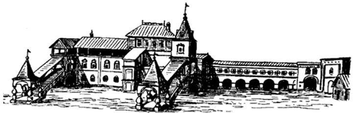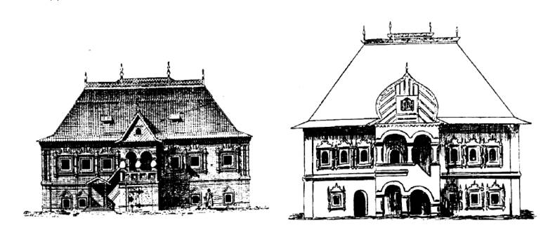 Стоит только сравнить приведенные рисунки каменных жилых зданий с видом знаменитого в свое время деревянного Коломенского дворца, чтобы увидать, как велико было у русских зодчих это стремление к воспроизведению старых привычных форм из нового материала.