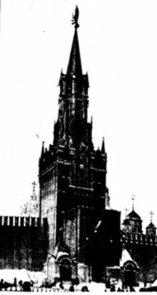 Наиболее известная Спасская башня московского кремля, построенная в 1491 году Петром Антонием Медолианским не дошла до нас в первоначальном виде в 1626 году она была перестроена английским архитектором Христофором Головеем (Голидеем?), причем наружные части здания получили достаточно ясно выраженную обработку в готическом вкусе.
