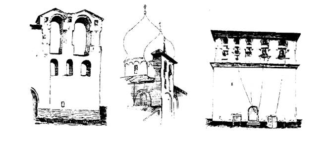 Кроме церквей, от XV в. дошли так называемые «звонницы» – постройки для вешания колоколов, заменявшие в древности башни-колокольни. Это были простые каменные стенки со сквозными пролетами для вешания колоколов. Первоначально, когда колокола были еще очень маленькими, звонницы устраивались на самых стенах храмов или вообще были тесно с ними связаны. Затем появились звонницы – отдельные постройки.
