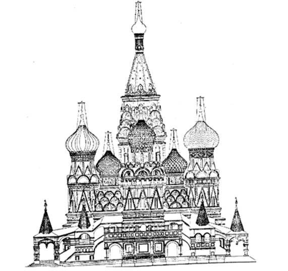 Храм Василия Блаженного наглядно отражал своими девятью престолами на одном основании эту исконную идею русского зодчества, был глубоко самобытен и с этой точки зрения.
