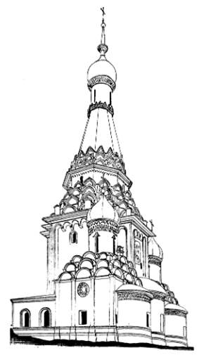 Появляются, наконец, и такие шатровые храмы, где вокруг главного, самого высокого шатра группируются более низкие шатровые крыши алтарей или приделов.