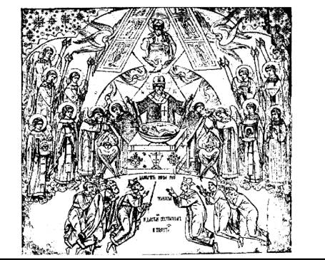 Композиции усложняются, становятся стройнее и продуманнее. В этом смысле интересна икона «Литургия ангелов», где Иисус Христос изображен в виде архиерея, совершающего литургию в сослужении ангелов. Над головою Христа – Св. Дух и благословляющий Бог-Отец. Внизу – благоговейно молящиеся царь, царица с придворными и надпись: «Да молчит всякая плоть человеча и да стоит со страхом и трепетом». Христос изображен на этой иконе дважды: в образе Агнца Божия и архиерея.