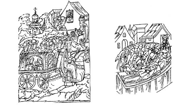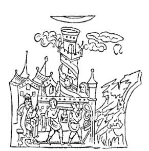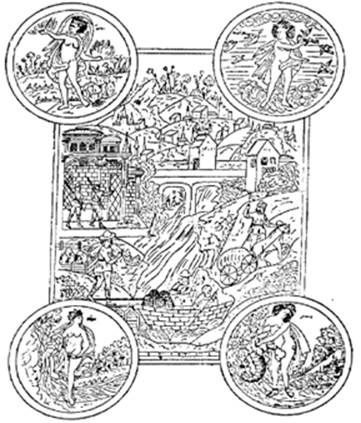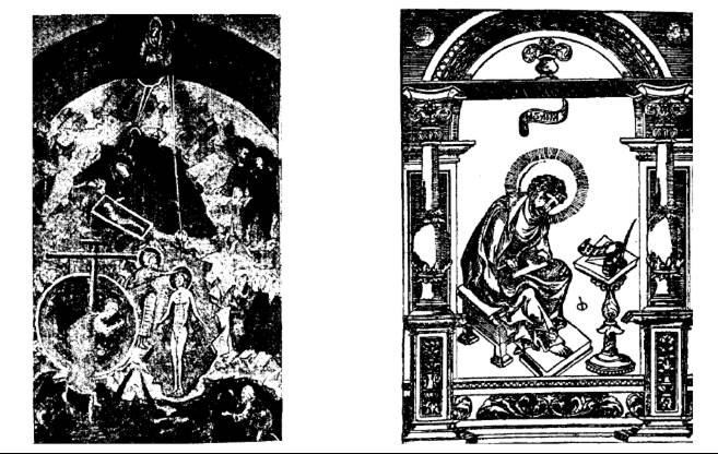 В этих аллегорических изображениях явственно веяло подчас и духом античной символики. Солнце олицетворялось, например, колесницею с ангелом (Аполлон), держащим в руках солнце; луна находилась в руках девы (Дианы), сидящей в запряженной волами колеснице.