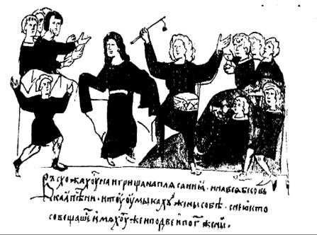Висковатого смущало, что в палате «написан образ Спасов, да туто же, близко него, написана жонка, спустя рукава, кабы пляшет, а подписано под нею – блужение». Не в меру преданного старине дьяка смущали все вообще в высшей степени благочестивые и поучительные аллегории, из которых состояло это не дошедшее до нас «бытейское письмо».