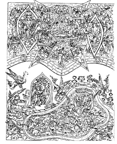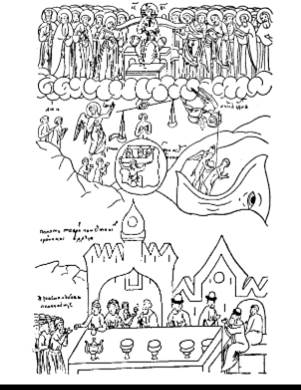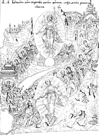 Миниатюра «хождение души по мытарствам», из принадлежавшего Ф.И. Буслаеву Синодика XVII века, представляет собою сложную композицию, очень похожую на фрески. Вверху – хождение души, а внизу – по привычке к параллелям ― бытовая сцена поминок.