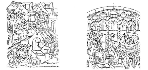 Появляются, наконец, в области миниатюрной живописи и робкие попытки иллюстрации исторических событий. Таковы, например, миниатюры Несторовой летописи так называемого Радзивилловского или Кенигсбергского списка конца XV века. Хотя эти миниатюры. первоначально нарисованные русскими мастерами, были впоследствии переделаны другим мастером, и по-видимому, немцем, он все же являются интересными, по своей древности, попытками живописного изображения исторических сюжетов.