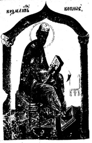 Рядом с нею можно, впрочем, поставить и попытки миниатюристов XV века создать портрет автора «Христианской топографии», Козьмы Индикоплова – рабское подражание изображениям евангелистов, даже с нимбом вокруг головы, хотя Козьма и не был причислен к лику святых.