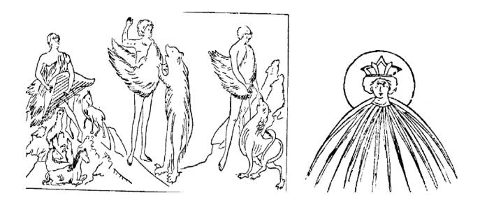 Но сверх рукописей священного содержания, художникам приходится иллюстрировать и такие сочинения, где надо изображать «псоглавых» людей, человекообразных птиц и даже «девицу Горгонею» (Горгону). Подобные задачи уже не смущают художника, привыкшего к символике. Он уже рисует и «Весну» в виде «преукрашенной красотою и добротою сияющей девы», и «Осень» в виде «мужа средовечного», и «Зиму» в виде «зело старого мужа».