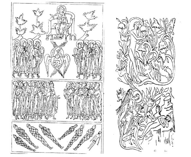 Ф.И. Буслаев обращает также внимание на интересное по замыслу сопоставление, иллюстрирующее стих 118 псалма: «Руце Твои сотвориси мя и создасте мя». Вверху изображен мастер, делающий из глины сосуд, а внизу, среди деревьев Господь, создающий Адама.