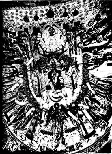 Но в фреске XVI века, при всех ее живописных достоинствах, не чувствуется особой глубины мысли. Отдельные части композиции недостаточно объединены: группа ангелов с Богоматерью до такой степени изолирована от группы святых внизу, что может иметь совершенно самостоятельное значение.