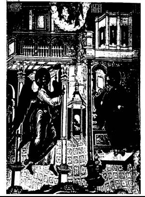 Воспроизводим также еще две миниатюры «Царственной Книги». На одной из них иллюстрирован следующий текст: «Того ж месяца марта великий князь Иван Васильевич всея Руссии и его мати великая княгиня Елена велели переделывати старыя деньги на новый чекан». Внизу изображена чеканка монеты, а вверху художник, быть может желая дополнить текст, изобразил сцену поднесения отчеканенных монет царю и царице-матери. Другая миниатюра изображает один из моментов коронования Грозного, когда вошедший на амвон архидиакон возглашает многолетие. Здесь особенно ценно изображение амвона, очень похожего на уцелевший новгородский амвон, едва ли не ошибочно считаемый принадлежностью древнего «пещного действа». Отметим еще в этой миниатюре, типичное для древней живописи одновременное изображение наружного и внутреннего вида здания. Нарисовав пять внутренних сводов храма, живописец изображает над ними наружное обличье Успенского собора: пять его глав...