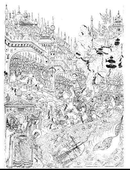 Несколько свободнее чувствовал себя миниатюрист XVI века в области светской исторической живописи и иллюстрации летописного текста. Здесь он не видал уже столь быстрой смены двух начал, небесного и земного, самые события, которые ему предстояло иллюстрировать, нередко были лишены высокого религиозного значения.