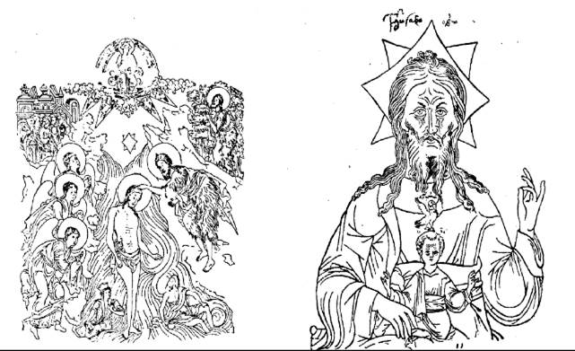 Наряду с этими наивными попытками – пояснить текст рисунками совершенно искажающими природу, миниатюрист нередко пользуется и античною символикой: изображает море и ветер в виде человѣческих фигур и т.п. Заключающиеся в псалтири пророчества художник поясняет иногда изображениями событий новозаветной истории. Рисунок распятия поясняет у него текст: «И даша в снедь мою жолчь и в жажду мою напоиша мя оцта». Изображение Крещения Господня поясняет, или лучше сказать, дополняет текст: «Ты утвердил еси силою Твоею море» и т.п.