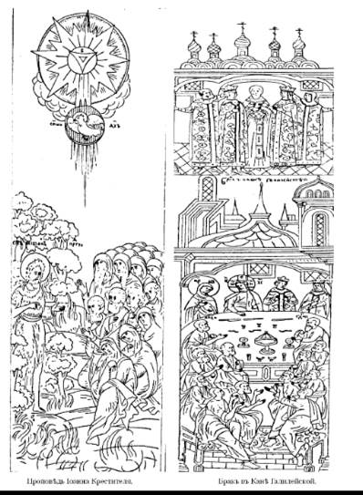 Композиция миниатюр становится законченнее, ближе напоминает иконы. Появляется разнообразие в фигурах, особенно заметное в миниатюре – проповедь Иоанна Крестителя. В склоненных женских фигурах уже чувствуется какая-то жеманная грация, недопустимая в священных изображениях более ранних эпох. Иногда религиозная миниатюра невольно стремится сблизиться с жизнью. Изображая брак в Кан Галилейской, художник рисует вверху целую жанровую сценку: современный ему обряд венчания...