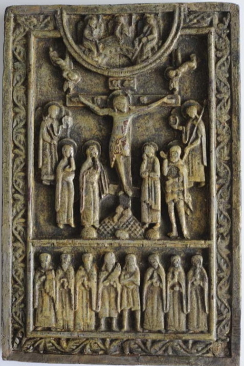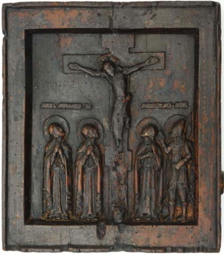 Описание: Икона прямоугольной формы, с ковчегом, разделённым на два регистра. В верхнем регистре, в центре, горельефное изображение Распятия с предстоящими Марией и святой женой ― слева, Иоанном и Лонгином Сотником ― справа. Изображения предстоящих профильные, в рост. На втором плане ― два архангела с зерцалами и мерилами в руках. Над Распятием ― два летящих ангела. На перекладине неразборчивая надпись. В верхней части ковчега ― полукруглый сегмент с изображением Троицы. В подножии креста ― гора Голгофа с головой Адама, орнаментирована сетчатым узором. В нижнем регистре представлен ряд святых, изображённых в рост, фронтально. Среди святых три святителя, святой со свитком, святой со скрещенными на груди руками и три мученицы с крестами в руках. Над ними фрагменты резных именующих надписей. Поля украшены резным растительным орнаментом. Изображения даны в высоком рельефе. Фон гладкий. Лицевая сторона окрашена в зеленоватый цвет, торцы в – голубой, оборот – в тёмно-коричневый.
