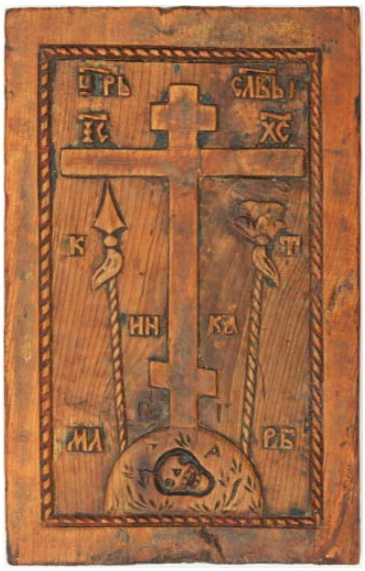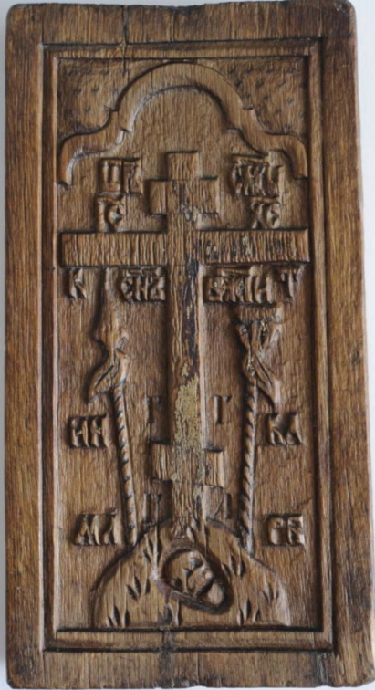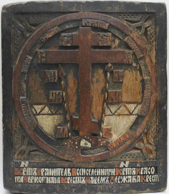 Описание: В центре композиции изображён восьмиконечный крест. Под крестом ― гора Голгофа с головой Адама, по сторонам ― копие и трость, отходящие под небольшим углом от основания. Вокруг креста ― резные надписи, монограммы и криптограммы: ЦРЬ СЛВЫ, ІС ХС, К («копие»), Т («трость»), СНЪ БОЖIИ, НИКА, МЛРБ («место лобное распят бысть»), ГГ («гора Голгофа»), ГА («глава Адама»). Резьба выемчатая, невысокого рельефа. Надписи обронные и резные вглубь. Средник обрамлён резным полуваликом с насечкой и гладкой рамкой. Доска с ковчегом.