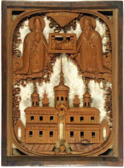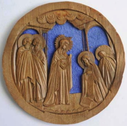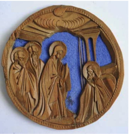 Описание: Икона круглой формы. В центре композиции представлена Богоматерь в сопровождении апостолов Петра и Иоанна. Преподобный Сергий изображён справа коленопреклоненным, вместе с преподобным Михеем, закрывшим лицо полой мантии. Фоном служит интерьер кельи. Вверху ― клубящиеся облака в форме круглых лепестков. Резьба сквозная, выполнена в невысоком рельефе, подложка ― синяя бумага. По краю ― гладкая рамка. Оборотная сторона оклеена плотной бумагой.