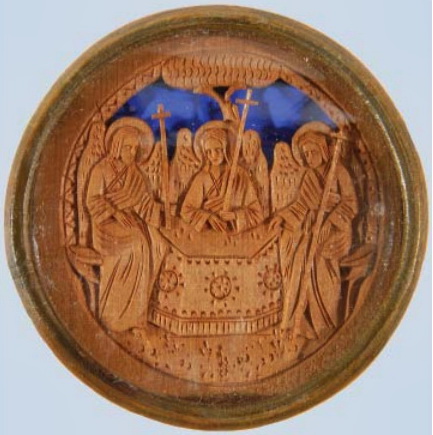 Описание: Икона круглой формы. На лицевой стороне изображена Святая Троица: в центре композиции ― три ангела, восседающие за столом, украшенным геометрическим орнаментом. Ангелы держат в руках посохи в форме креста. Резьба сквозная, выполнена в невысоком рельефе, подложка ― синяя шёлковая ткань. Рамка круглая, профилированная, застеклённая. Оборотная сторона обтянута бархатом кирпичного цвета.