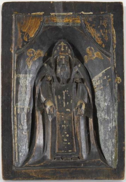 Описание: В ковчеге фронтальное, в рост, резное изображение преподобного Нила Столобенского, выполненное в высоком рельефе. Святой представлен со склонённой на грудь головой, опирающимся на костыли. Преподобный в схимническом облачении: в мантии, парамане и куколе. В верхних углах ковчега вырезаны два полукруглых сегмента. По сторонам фигуры святого изображены два херувима в виде ликов с крыльями. Слева ― потир и кресты (?). Дерево тёмное. Сохранились фрагменты росписи: белые кресты и точки на куколе и парамане святого, зелёные, белые, охристые пятна на фоне. Доска с ковчегом и узкими полями, без шпонок.