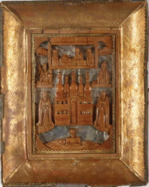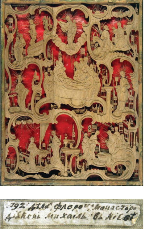 Описание: Икона прямоугольной формы. Резная композиция представлена в ковчеге, под стеклом. Резьба сквозная, в качестве фона проложена фольга красного цвета. В центре композиции представлено Успение Богоматери. Вокруг изображены Праздники и святые. Вверху, слева, ― композиция Явления Христа женам-мироносицам. Вверху, справа, ― Рождество Христово. По сторонам центральной композиции изображены в рост святые мученицы: слева ― Екатерина, справа ― Варвара. Внизу, слева, ― Благовещение, справа ― Рождество Богородицы. Каждое клеймо обрамлено завитками рокайля. От нимбов святых исходит сияние в виде тонких резных лучей. На заднем плане ― архитектура в виде башнеобразных построек с узкими и круглыми окнами, с зубчатыми завершениями. Резьба тонкая, в высоком многоуровневом рельефе, фигуры изящны и пластичны, мелкая проработка деталей. Оборот и торцы обтянуты светло-зелёным шёлком. Поля украшены полосками и кружками из фольги. На левом торце бумажная наклейка с надписью: 1792: ДѢЛА(Л) ФЛОРО... МАНАСТОРА ДІЯКОНЪ МИХАІЛЪ В КІЕВЕ. На правом торце бумажная бирка с чернильной надписью: 1792: ДЕЛАЛ ФЛОРО... МАНАСТОРА ДІЯКОНЪ МИХАІЛЪ В КІЕВѢ.