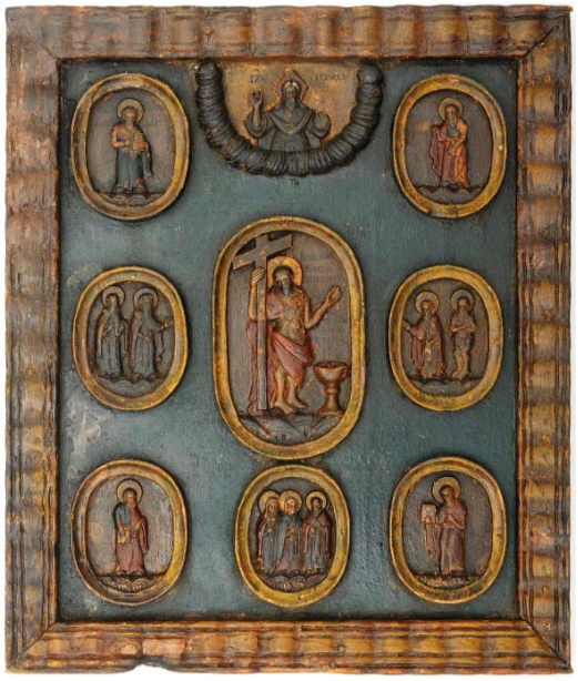 Описание: В среднике, в восьми овальных и одной полукруглой накладных рамках, представлены святые. В центральном клейме в рост изображён Иисус Христос, правой рукой придерживающий высокий четырёхконечный крест, левая ― приподнята; справа ― чаша на высоком поддоне. На фоне надпись чёрным: АЗЪ ЕСМЬ ХЛЕБЪ ЖИВОТН(ЫЙ). Вверху, в полукруглой резной, имитирующей облака рамке, изображён Саваоф (ГДЬ САѴАѠѲЪ), благословляющий правой рукой. В угловых клеймах представлены евангелисты с Евангелиями в руках: вверху, слева, ― Марк, справа ― Иоанн (?), внизу, слева, ― Матфей, справа ― Лука (?). В боковых и нижнем клеймах группами изображены святые, по двое ― в боковых, и трое ― в нижнем. Нимбы святых круглой формы, у Саваофа ― треугольный. На иконе сохранились фрагменты красочного слоя: на рамках ― охристого цвета, на одеяниях ― красного, на лике у Христа ― позолоты. Именующие надписи чёрные, сохранились фрагментарно. Фон иконы ― чёрная потемневшая олифа. Резьба выполнена в высоком многоуровневом рельефе. Икона в накладной раме, вырезанной волнами и орнаментированной параллельными полосами, тёмно-охристого цвета, со следами позолоты. Доска без киота и ковчега.